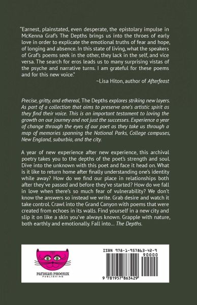 Precise, gritty, and ethereal, The Depths explores striking new layers. As part of a collection that aims to preserve one's artistic spirit as they find their voice. This is an important testament to loving the growth on our journey and not just the successes. Experience a year of change through the eyes of our poet as they take us through a map of memories spanning the National Parks, College campuses, New England, suburbia, and the city. A year of new experience after new experience, this archival poetry takes you to the depths of the poet's strength and soul. Dive into the unknown with this poet and face it head on. What is it like to return home after finally understanding one's identity while away? How do we find our place in relationships both after they've passed and before they've started? How do we fall in love when there's so much fear of vulnerability? We don't know the answers so instead we write. Grab desire and watch it take control. Crawl into the Grand Canyon with poems created from echoes in its walls. Find yourself in a new city and slip it on like a skin you've always known. Grapple with nature, both earthly and emotionally. Fall into... The Depths.