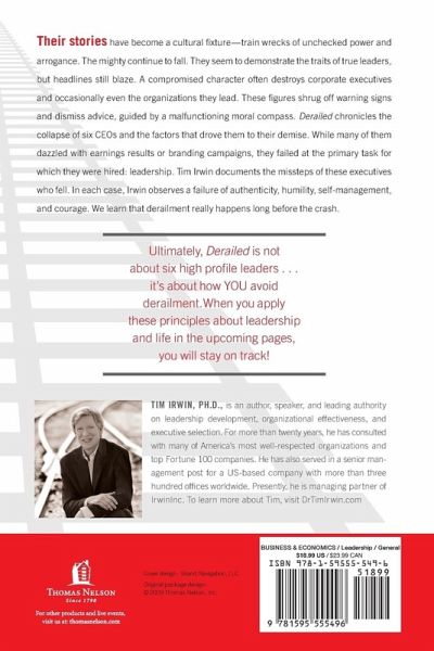 Do you know the stories of well-known CEOs who failed as executives of major companies? Learn about these colorful derailers who misread symptoms of their own downfall and failed to take corrective action needed to succeed as leaders. Written for leaders, aspiring leaders, and anyone who makes a difference in the lives of others, author and leadership expert Tim Irwin, PhD, examines how failures of character common to even the most capable individuals - including deficits in authenticity, humility, self-management, and courage - repeatedly lead to downfall. By profiling the collapse of CEOs Robert Nardelli (Home Depot), Carly Fiorina (HP), Durk Jager (Proctor and Gamble), Steven Heyer (Starwood Hotels), and more, this book shows how our failings become more dangerous as we take on greater leadership responsibilities, and how they can cause us to ignore glaring warning signs that might otherwise prevent catastrophe. In Derailed, Tim shares;An outline of the key character traits that prevent us from becoming de-railed Assessments and suggestions on how to analyze your "Character Quotient" What made these business executives fail without demeaning their character By asking what we can learn from those who have fallen, and how we can avoid our own failure, Derailed teaches us to stay on track. Often, derailment happens long before the crash. Learn the character qualities that are essential for successful leadership and how to cultivate them so that you can avoid derailing your own life and career.