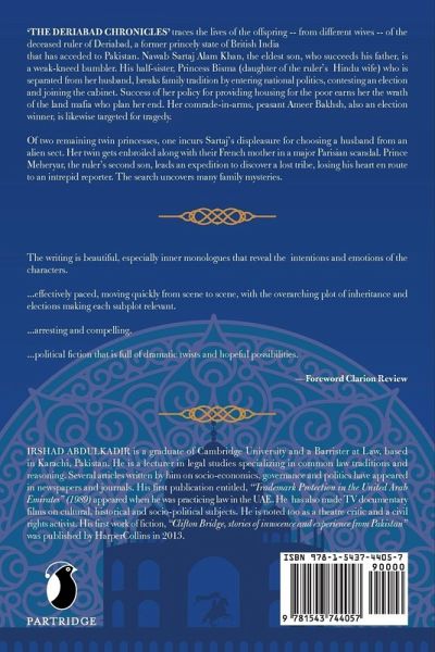 The Deriabad Chronicles traces the lives of the offspring -- from different wives -- of the deceased ruler of Deriabad, a former princely state of British India that has acceded to Pakistan. Nawab Sartaj Alam Khan, the eldest son, who succeeds his father, is a weak-kneed bumbler. His half-sister, Princess Bisma (daughter of the rulers Hindu wife) who is separated from her husband, breaks family tradition by entering national politics, contesting an election and joining the cabinet. Success of her policy for providing housing for the poor earns her the wrath of the land mafia who plan her end. Her comrade-in-arms, peasant Ameer Bakhsh, also an election winner, is likewise targeted for tragedy. Of two remaining twin princesses, one incurs Sartajs displeasure for choosing a husband from an alien sect. Her twin gets enbroiled along with their French mother in a major Parisian scandal. Prince Meheryar, the rulers second son, leads an expedition to discover a lost tribe, losing his heart en route to an intrepid reporter. The search uncovers many family mysteries.