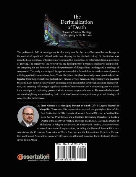 The problematic field of investigation for this study was for the care of bereaved human beings in the context of significant cultural shifts now shaping the twenty-first century. Deritualization was identified as a significant interdisciplinary concern that contributes to potential distress in processes of grieving. The objective of the research was the development of a practical theology of compassionate caregiving for the bereaved with deference to the problem of deritualization. The theoretical framework was guided by the Oxford Interdisciplinary Research model and the Loyola Institute of Ministries model of practical theology. The study was designed for applied research for funeral directors and vocational pastors utilizing qualitative research methods. Hermeneutical and empirical components addressed six research questions through two domains of inquiry: disciplinary perspectives and educational dynamics of bereavement caregiving. Using the method of hermeneutics to critically evaluate the first two research questions, three disciplinary fields of knowledge were examined and integrated from the perspective of pastoral care: funeral service, bereavement psychology, and practical theology. Each discipline individually converged upon meaningful caregiving, meaning-reconstruction, and meaning-reframing as significant modes of bereavement care. Using ethnographic semi-structured interviews to critically evaluate the remaining four research questions, data were collected from a Christian university and a mortuary college. The interview questionnaire included twenty-five main questions organized in four parts: Philosophy of Education, Hermeneutics of Bereaved Families, Care of Bereaved Families, and Encounter of Bereaved Families. The study utilized two cycles of qualitative coding techniques to report the findings of each participating school. A hybrid form of in vivo and holistic coding as well as a second cycle of pattern coding distilled the interview responses into actionable statements that reinforced bereavement caregiving. By synthesizing all of the findings, a compelling case was made for a paradigm of comforting presence supported by principles from a Louwian perspective of practical theology, including theological anthropology, promissiotherapy, bipolarity, and hermeneutics. The study connected a philosophy of meaning-reframing and a paradigm of comforting presence to a meta-theoretical framework within a narrative approach to care. The research elucidated an interdisciplinary understanding that contributed toward a compassionate practical theology of caregiving for the bereaved.