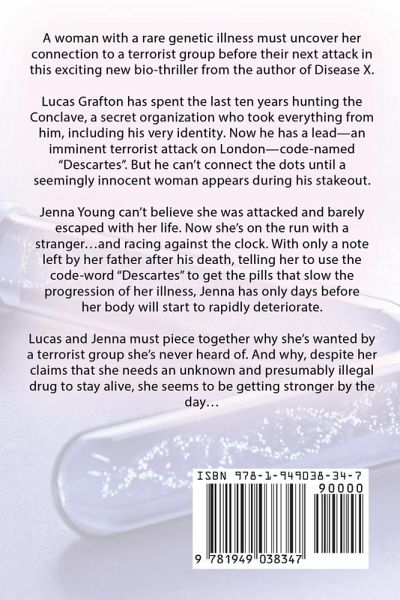 A woman with a rare genetic illness must uncover her connection to a terrorist group before their next attack in this exciting new bio-thriller from the author of Disease X. Lucas Grafton has spent the last ten years hunting the Conclave, a secret organization who took everything from him, including his very identity. Now he has a lead--an imminent terrorist attack on London--code-named "Descartes". But he can't connect the dots until a seemingly innocent woman appears during his stakeout. Jenna Young can't believe she was attacked and barely escaped with her life. Now she's on the run with a stranger...and racing against the clock. With only a note left by her father after his death, telling her to use the code-word "Descartes" to get the pills that slow the progression of her illness, Jenna has only days before her body will start to rapidly deteriorate. Lucas and Jenna must piece together why she's wanted by a terrorist group she's never heard of. And why, despite her claims that she needs an unknown and presumably illegal drug to stay alive, she seems to be getting stronger by the day...
