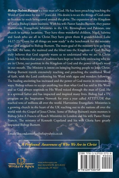 Bishop Dalton Burnett is a true man of God. He has been preaching/teaching the Word of God since he was 17 years old. His desire is to see the things of God come to fruition by souls being saved around the globe. e expansion of the Kingdom of God is Bishop's main business. With his wife Pastor Sandra Burnett, they pastor Harvestime Evangelistic Ministries in the UK, Birmingham and Pakistan, one church in various locations. They have three wonderful children, Nigel, Sabrina and Sarah who are all in Christ. They have given them 8 grandchildren. Luke 14:17-23 "Come for all things are now ready" is the benchmark for the ministry that God assigned to Bishop Burnett. e main goal of the ministry is to go bring the halt, the lame, the maimed and the blind into the Kingdom of God. Bishop truly believes that God urgently wants us to understand who we are in Christ Jesus. He believes that years of tradition have kept us from fully embracing who we are in Christ, our position in the Kingdom of God and the power of God's word in our mouth. e Ministry is intent on bringing hurting people to Jesus Christ. Bishop Burnett travels extensively teaching and preaching the undiluted Word of faith, with the Lord con confirming his Word with signs and wonders following. e healing anointing has increased and the power of God moves in tremendous ways. Bishop refuses to accept anything less than what God has said in His Word and so God always responds to His Word voiced through the man of God. He is a spiritual father and has impacted and inspired many lives. Bishop had a TV program on the Inspiration Network for over a year called ATTITUDE that reached tens of millions all over the world. Harvestime Evangelistic Ministries is a growing church in the heart of the UK reaching out to the nations all over the world with the Gospel of Jesus Christ. Some of Bishop Burnett's main mentors is Bishop John A Francis of Ruach Ministries in London and his wife Pastor Penny Francis. e ministry of Kenneth Copeland and his wife Gloria have greatly impacted Bishop Burnett. Email: descendantsofgodinfo@yahoo.co.uk
