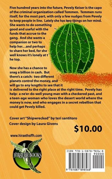 Five hundred years into the future, Pevely Keiser is the capo of the criminal organization called Temmen. Temmen runs itself, for the most part, with only a few lethal nudges from Pevely to keep people in line. Lately she has two things on her mind. She wants to do something good and useful with the funds that accrue to the gang. And she wants a companion or two to help her...and perhaps to share her bed, for she well knows it's lonely at the top. Now she has a chance to snag a billion in cash. But there's a catch: two different planets control the money, and will go to any lengths to see that it is delivered to the right place at the right time. Pevely has help: a ne'er-do-well young man with a checkered past, and a teen-age woman who loves the desert world where the money is now, and who engages in a secret rebellion that could get Pevely killed.