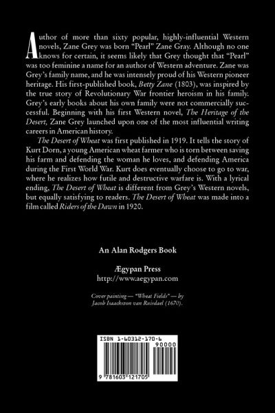 Author of more than sixty popular, highly-influential Western novels, Zane Grey was born "Pearl" Zane Gray. Although no one knows for certain, it seems likely that Grey thought that "Pearl" was too feminine a name for an author of Western adventure. Zane was Grey's family name, and he was intensely proud of his Western pioneer heritage. His first-published book, Betty Zane (1803), was inspired by the true story of Revolutionary War frontier heroism in his family. Grey's early books about his own family were not commercially successful. Beginning with his first Western novel, The Heritage of the Desert, Zane Grey launched upon one of the most influential writing careers in American history. The Desert of Wheat was first published in 1919. It tells the story of Kurt Dorn, a young American wheat farmer who is torn between saving his farm and defending the woman he loves, and defending America during the First World War. Kurt does eventually choose to go to war, where he realizes how futile and destructive warfare is.