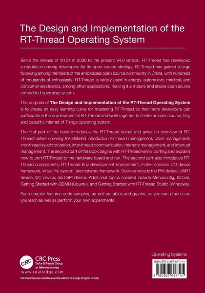 This book covers embedded real-time multi-threaded operating system called RT-Thread. RT-Thread supports multiple chip architectures, compilers and IDEs, and is free to use. The book has two parts: the kernel and device components. Each chapter features code samples