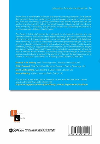 The Design of Animal Experiments is intended for all research scientists who use laboratory animals, with the aim of helping them to design their own experiments more effectively and/or to improve their ability to communicate with professional statisticians when necessary. It covers all randomised controlled experimental designs likely to be needed in laboratory animal research, with worked examples showing how they can be statistically analysed. It suggests the more widespread use of randomised block designs and shows how both males and females can be included in an experiment without the need to increase the total number of animals by using factorial designs. It also includes guidance on the choice of experimental animals. The book covers the learning outcomes of Module 10 and part (ii) of Module 11 of education and training under Directive 2010/63/EU.
