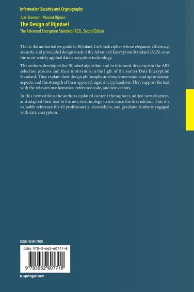 This is the authoritative guide to Rijndael, the block cipher whose elegance, efficiency, security, and principled design made it the Advanced Encryption Standard (AES), now the most widely applied data encryption technology. The authors developed the Rijndael algorithm and in this book they explain the AES selection process and their motivation in the light of the earlier Data Encryption Standard. They explain their design philosophy and implementation and optimization aspects, and the strength of their approach against cryptanalysis. They support the text with the relevant mathematics,…mehr