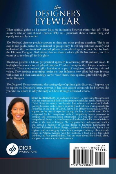 What spiritual gift(s) do I possess? Does my instinctive behavior mirror this gift? What ministry roles or tasks should I pursue? Why am I passionate about a certain thing and equally irritated by another? The Designer's Eyewear provides answers to these and other probing questions. This is an easy-to-use guide, perfect for individual or group study. It will help believers identify and understand their motivational spiritual gifts or custom-fitted eyewear prescribed by God, the Ultimate Designer. God desires that we discern which gift He has assigned, and He wants us to use that gift for His glory. This book presents a biblical yet practical approach to achieving 20/20 spiritual vision. It highlights the seven spiritual gifts of Romans 12, which comprise the Designer's exclusive eyewear. These motivational gifts function as a pair of eyeglasses, enhancing spiritual vision. They produce motivating tendencies that influence how gifted believers interact with others and their surroundings. As we "wear" them, these spiritual gifts will bring glory to the Designer. The Designer's Eyewear represents the cutting edge of spiritual gifts discovery. I implore you to explore the Designer's luxury eyewear. It has been created exclusively for believers like you who are drawn to edify the body of Christ through dedicated service.