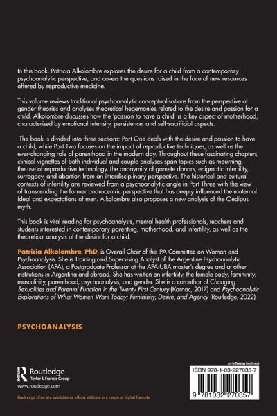 This volume reviews traditional psychoanalytic conceptualisations from the perspective of gender theories and analyses theoretical hegemonies related to the desire and passion for a child. Alkolombre discusses how the 'passion to have a child' is a key aspect of motherhood, characterised by emotional intensity, persistence, and self-sacrificial aspects.