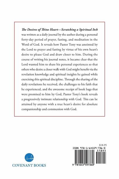 The Desires of Thine Heart—Scratching a Spiritual Itch was written as a daily journal by the author during a personal forty-day period of prayer, fasting, and meditation in the Word of God. It reveals how Pastor Tony was anointed by the Lord to prayer and fasting by virtue of his own heart’s desire to please God and draw closer to him. During the course of writing his journal notes, it became clear that the Lord wanted him to share his personal experiences so that others who desire a closer walk with God might benefit via the revelation knowledge and spiritual insights he gained while exercising this spiritual discipline. Through the sharing of the daily revelations he received, the challenges to his faith that he experienced, and the awesome receipt of book bags that were promised to him by God, Pastor Tony’s book reveals a progressively intimate relationship with God. This can be attained by anyone with a true heart’s desire for absolute companionship and communion with God.