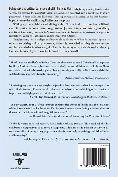 Pulmonary and critical care specialist Dr. Phineas Mann is fighting a losing battle with a severe, progressive form of Parkinson's disease. He is accepted into a novel trial to insert programmed stem cells into his brain. This experimental treatment is his last desperate hope to reverse his debilitating Parkinson's symptoms. While grappling with his own declining health, Phineas is asked to consult on a difficult case. The patient is conservative congressman Quentin Tate, whose misdiagnosed lung condition has rapidly worsened. Phineas draws on his decades of experience in a quest to identify the cause of Tate's rare and life-threatening disease. Then his wife, Iris, develops an obscure blood disorder. When her medical specialist orders a surprising and risky treatment, Phineas is compelled to bring his keen eye and medical knowledge into her struggle. Time is his enemy as he, with his loyal service dog Ernest at his side, fights to save his beloved Iris, then himself.