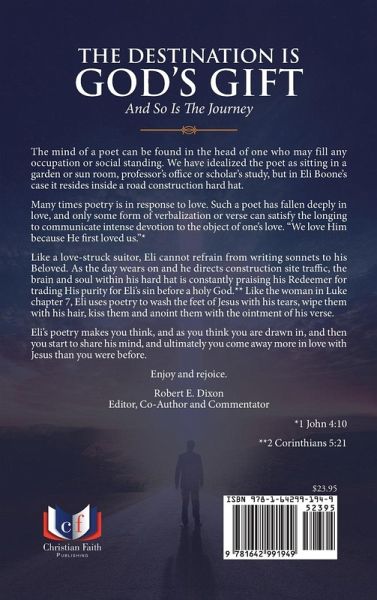 The mind of a poet can be found in the head of one who may fill any occupation or social standing. We have idealized the poet as sitting in a garden or sun room, professor’s office or scholar’s study, but in Eli Boone’s case it resides inside a road construction hard hat. Many times poetry is in response to love. Such a poet has fallen deeply in love, and only some form of verbalization or verse can satisfy the longing to communicate intense devotion to the object of one’s love. "We love Him because He first loved us."* Like a love-struck suitor, Eli cannot refrain from writing sonnets to his Beloved. As the day wears on and he directs construction site traffic, the brain and soul within his hard hat is constantly praising his Redeemer for trading His purity for Eli’s sin before a holy God.** Like the woman in Luke chapter 7, Eli uses poetry to wash the feet of Jesus with his tears, wipe them with his hair, kiss them and anoint them with the ointment of his verse. Eli’s poetry makes you think, and as you think you are drawn in, and then you start to share his mind, and ultimately you come away more in love with Jesus than you were before. Enjoy and rejoice. Robert E. Dixon Editor and Co Author and Commentator *1 John 4:10 **2 Corinthians 5:21