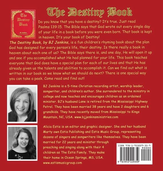 Do you know that you have a destiny? It's true, just read Psalms 139:15. The Bible says, that God wrote out every single day of your life in a book before you were even born. That book is kept in heaven, it's your book of Destiny! The Destiny Book, by BJ Jenkins, is a fun children's rhyming book about the plan God has designed for every person's life, their destiny. Is there really a book in heaven about each one of us? The Bible says there is, and one day He will open it up and see if you accomplished what He had planned for your life. This book teaches everyone that God does have a special plan for each of our lives and that He has already given us the talents and abilities to accomplish it. Can we find out what is written in our book so we know what we should do next? There is one special way you can take a peek, come read and find out!