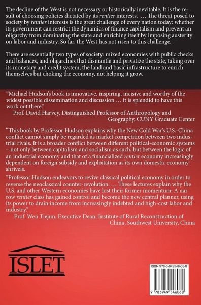 This book is based on the lecture series on finance capitalism Michael Hudson presented for the Global University for Sustainability. The book explains why the U.S. and other Western economies have lost their former momentum: A narrow rentier class has gained control and become the new central planner, using its power to drain income from increasingly indebted and high-cost labor and industry. The American disease of de-industrialization has resulted from the costs of industrial production being inflated by the economic rents extracted by this class under the system of financialized monopoly capitalism that now prevails throughout the West. The book explains why the U.S.-China conflict cannot simply be regarded as market competition between two industrial rivals. It is a broader conflict between different political economic systems - not only between capitalism and socialism as such, but between the logic of an industrial economy and that of a financialized rentier economy increasingly dependent on foreign subsidy and exploitation as its own domestic economy shrivels. Professor Hudson endeavors to revive classical political economy in order to reverse the neoclassical counter-revolution.