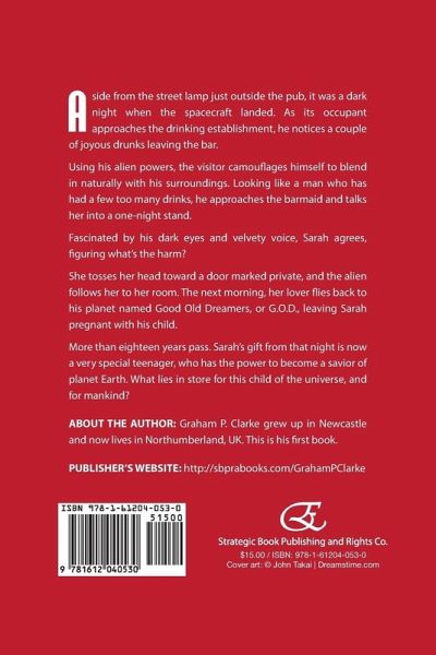 Aside from the street lamp just outside the pub, it was a dark night when the spacecraft landed. As its occupant approaches the drinking establishment, he notices a couple of joyous drunks leaving the bar. Using his alien powers, the visitor camouflages himself to blend in naturally with his surroundings. Looking like a man who has had a few too many drinks, he approaches the barmaid and talks her into a one-night stand. Fascinated by his dark eyes and velvety voice, Sarah agrees, figuring what's the harm? She tosses her head toward a door marked private, and the alien follows her to her room. The next morning, her lover flies back to his planet named Good Old Dreamers, or G.O.D., leaving Sarah pregnant with his child. More than eighteen years pass. Sarah's gift from that night is now a very special teenager, who has the power to become a savior of planet Earth. What lies in store for this child of the universe, and for mankind? About the Author: Graham P. Clarke grew up in Newcastle and now lives in Northumberland, UK. This is his first book. Publisher's website: http://sbprabooks.com/GrahamPClarke