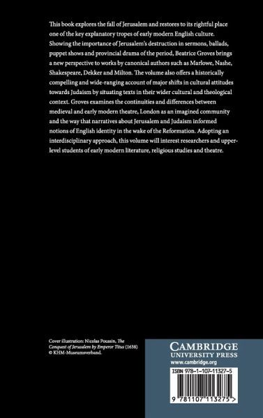 This book explores the fall of Jerusalem and restores to its rightful place one of the key explanatory tropes of early modern English culture. Showing the importance of Jerusalem's destruction in sermons, ballads, puppet shows and provincial drama of the period, Beatrice Groves brings a new perspective to works by canonical authors such as Marlowe, Nashe, Shakespeare, Dekker and Milton. The volume also offers a historically compelling and wide-ranging account of major shifts in cultural attitudes towards Judaism by situating texts in their wider cultural and theological context. Groves examines the continuities and differences between medieval and early modern theatre, London as an imagined community and the way that narratives about Jerusalem and Judaism informed notions of English identity in the wake of the Reformation. Adopting an interdisciplinary approach, this volume will interest researchers and upper-level students of early modern literature, religious studies and theatre.