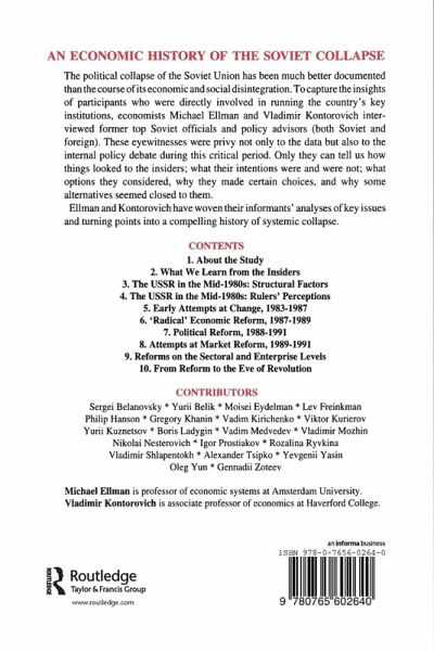The inside story of the political collpase of the Soviet Union is far better understood than the course of economic and social disintegration. In order to capture the story, the editors compiled a list of questions which they addressed to former top Soviet officials and economic and other policy advisors (both Soviet and foreign) who were privy not only to data on the functioning of the Soviet economy but also to the internal policy debate during the 1980s. This volume assembles the Informants' analyses of key issues and the turning points, and weaves them into a compelling history of systemic collapse. Among the topics investigated are: economic policies in the 1980s; the standard of living: the reliability of Soviet statistics; Gosplan's projections for the economy to the year 2000; was the arms race starving the civilian economy? the role of ideology in supporting the functioning of an economic system; the party's participating in economic management; the influence of foreign advisors; the struggle over a transition program; the functioning and collapse of the supply system, the CMEA, and the foreign trade system.