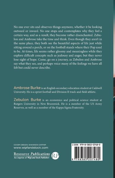 No one ever sits and observes things anymore, whether it be looking outward or inward. No one stops and contemplates why they feel a certain way, and as a result, they become rather disenchanted. Zebulon and Ambrose take the time and think. Even though they aren't in the same place, they both see the beautiful aspects of life just while sitting around a porch, or on the football stands where their Pop used to be. At times, life seems rather gloomy and meaningless while they explore difficult concepts such as jealousy and anger, but they never lose sight of hope. Come, go on a journey, as Zebulon and Ambrose say what they see, and perhaps voice many of the feelings we have all felt but could never describe.