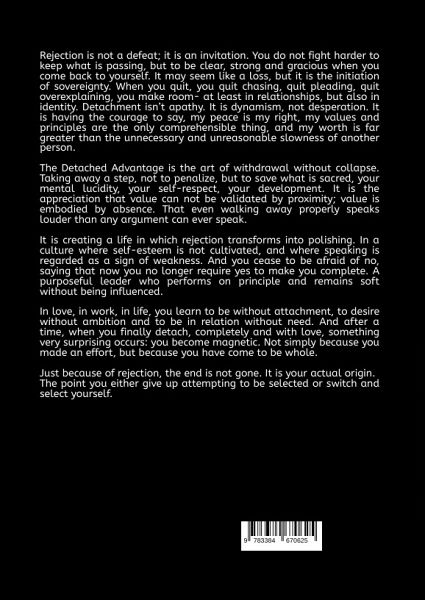 Rejection is not a defeat; it is an invitation. You do not fight harder to keep what is passing, but to be clear, strong and gracious when you come back to yourself. It may seem like a loss, but it is the initiation of sovereignty. When you quit, you quit chasing, quit pleading, quit overexplaining, you make room- at least in relationships, but also in identity. Detachment isn't apathy. It is dynamism, not desperation. It is having the courage to say, my peace is my right, my values and principles are the only comprehensible thing, and my worth is far greater than the unnecessary and unreasonable slowness of another person.The Detached Advantage is the art of withdrawal without collapse. Taking away a step, not to penalize, but to save what is sacred, your mental lucidity, your self-respect, your development. It is the appreciation that value can not be validated by proximity; value is embodied by absence. That even walking away properly speaks louder than any argument can ever speak.It is creating a life in which rejection transforms into polishing. In a culture where self-esteem is not cultivated, and where speaking is regarded as a sign of weakness. And you cease to be afraid of no, saying that now you no longer require yes to make you complete. A purposeful leader who performs on principle and remains soft without being influenced.In love, in work, in life, you learn to be without attachment, to desire without ambition and to be in relation without need. And after a time, when you finally detach, completely and with love, something very surprising occurs: you become magnetic. Not simply because you made an effort, but because you have come to be whole.Just because of rejection, the end is not gone. It is your actual origin.The point you either give up attempting to be selected or switch and select yourself.