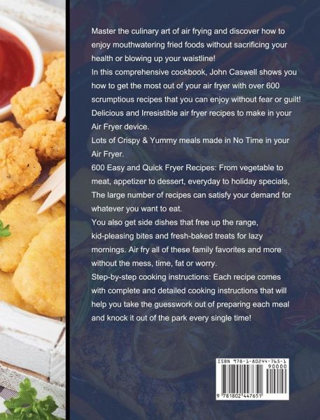 Master the culinary art of air frying and discover how to enjoy mouthwatering fried foods without sacrificing your health or blowing up your waistline! In this comprehensive cookbook, John Caswell shows you how to get the most out of your air fryer with over 600 scrumptious recipes that you can enjoy without fear or guilt! Delicious and Irresistible air fryer recipes to make in your Air Fryer device. Lots of Crispy & Yummy meals made in No Time in your Air Fryer. 600 Easy and Quick Fryer Recipes: From vegetable to meat, appetizer to dessert, everyday to holiday specials, The large number of recipes can satisfy your demand for whatever you want to eat. You also get side dishes that free up the range, kid-pleasing bites and fresh-baked treats for lazy mornings. Air fry all of these family favorites and more without the mess, time, fat or worry. Step-by-step cooking instructions: Each recipe comes with complete and detailed cooking instructions that will help you take the guesswork out of preparing each meal and knock it out of the park every single time!