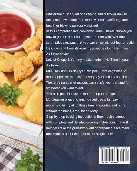 Master the culinary art of air frying and discover how to enjoy mouthwatering fried foods without sacrificing your health or blowing up your waistline! In this comprehensive cookbook, John Caswell shows you how to get the most out of your air fryer with over 600 scrumptious recipes that you can enjoy without fear or guilt! Delicious and Irresistible air fryer recipes to make in your Air Fryer device. Lots of Crispy & Yummy meals made in No Time in your Air Fryer. 600 Easy and Quick Fryer Recipes: From vegetable to meat, appetizer to dessert, everyday to holiday specials, The large number of recipes can satisfy your demand for whatever you want to eat. You also get side dishes that free up the range, kid-pleasing bites and fresh-baked treats for lazy mornings. Air fry all of these family favorites and more without the mess, time, fat or worry. Step-by-step cooking instructions: Each recipe comes with complete and detailed cooking instructions that will help you take the guesswork out of preparing each meal and knock it out of the park every single time!