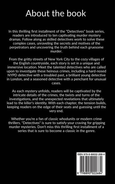 In this thrilling first installment of the "Detectives" book series, readers are introduced to ten captivating murder mystery dramas. Follow along as skilled detectives work to solve these complex cases, unraveling the secrets and motives of the perpetrators and uncovering the truth behind each gruesome murder. From the gritty streets of New York City to the cozy villages of the English countryside, each story is set in a unique and immersive location. Meet the talented detectives who are called upon to investigate these heinous crimes, including a hard-nosed NYPD detective with a troubled past, a brilliant young detective in London, and a seasoned detective with a penchant for unusual cases. As each mystery unfolds, readers will be captivated by the intricate details of the crimes, the twists and turns of the investigations, and the unexpected revelations that ultimately lead to the killer's identity. With each chapter, the tension builds, keeping readers on the edge of their seats and guessing until the very end. Whether you're a fan of classic whodunits or modern crime thrillers, "Detectives" is sure to satisfy your craving for gripping murder mysteries. Don't miss this thrilling first installment of a series that is sure to become a classic in the genre.