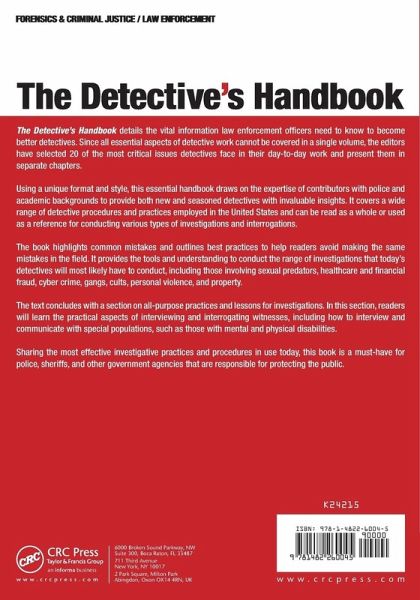 The Detective's Handbook details the vital information law enforcement officers need to know to become better detectives. Since all essential aspects of detective work cannot be covered in a single volume, the editors have selected 20 of the most critical issues detectives face in their day-to-day work and present them in separate chapters. Using a unique format and style, this essential handbook draws on the expertise of contributors with police and academic backgrounds to provide both new and seasoned detectives with invaluable insights. It covers a wide range of detective procedures and practices employed in the United States and can be read as a whole or used as a reference for conducting various types of investigations and interrogations. The book highlights common mistakes and outlines best practices to help readers avoid making the same mistakes in the field. It provides the tools and understanding to conduct the range of investigations that today's detectives will most likely have to conduct, including those involving sexual predators, healthcare and financial fraud, cyber crime, gangs, cults, personal violence, and property. The text concludes with a section on all-purpose practices and lessons for investigations. In this section, readers will learn the practical aspects of interviewing and interrogating witnesses, including how to interview and communicate with special populations, such as those with mental and physical disabilities. Sharing the most effective investigative practices and procedures in use today, this book is a must-have for police, sheriffs, and other government agencies that are responsible for protecting the public.