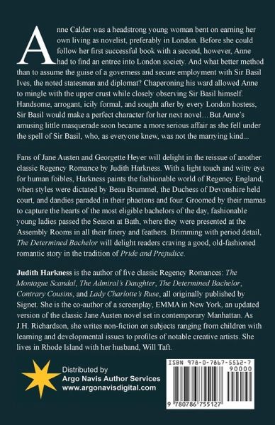 A COUNTERFEIT GOVERNESS Anne Calder was a headstrong young woman bent on earning her own living as novelist, preferably in London. Before she could follow her first successful book with a second, however, Anne had to find an entree into London society. And what better method than to assume the guise of a governess and secure employment with Sir Basil Ives, the noted statesman and diplomat? Chaperoning his ward allowed Anne to mingle with the upper crust while closely observing Sir Basil himself. Handsome, arrogant, icily formal, and sought after by every London hostess, Sir Basil would make a perfect character for her next novelBut Anne's amusing little masquerade soon became a more serious affair as she fell under the spell of Sir Basil, who, as everyone knew, was not the marrying kind... Fans of Jane Austen and Georgette Heyer will delight in the reissue of another classic Regency Romance by Judith Harkness. With a light touch and witty eye for human foibles, Harkness paints the fashionable world of Regency England, when styles were dictated by Beau Brummel, the Duchess of Devonshire held court, and dandies paraded in their phaetons and four. Groomed by their mamas to capture the hearts of the most eligible bachelors of the day, fashionable young ladies passed the Season at Bath, where they were presented at the Assembly Rooms in all their finery and feathers. Brimming with period detail, "The Determined Bachelor" will delight readers craving a good, old-fashioned romantic story in the tradition of "Pride and Prejudice." Judith Harkness is the author of five classic Regency Romances: "The Montague Scandal, The Admiral s Daughter, The Determined Bachelor, Contrary Cousins," and "Lady Charlotte s Ruse," all originally published by Signet. She is the co-author of a screenplay, EMMA in New York, an updated version of the classic Jane Austen novel set in contemporary Manhattan. As J.H. Richardson, she writes non-fiction on subjects ranging from children with learning and developmental issues to profiles of notable creative artists. She lives in Rhode Island with her husband, Will Taft. "Jane Austen Alert!" Carla Sarett, Ph.D. Radnor, PA . Author, Nine Romantic Stories. "