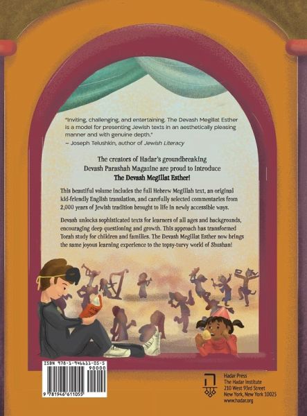 The creators of Hadar's groundbreaking Devash Parashah Magazine are proud to introduce The Devash Megillat Esther! This beautiful volume includes the full Hebrew Megillah text, an original kid-friendly English translation, and carefully selected commentaries from 2,000 years of Jewish tradition brought to life in newly accessible ways. Devash unlocks sophisticated texts for learners of all ages and backgrounds, encouraging deep questioning and growth. This approach has transformed Torah study for children and families. The Devash Megillat Esther now brings the same joyous learning experience to the topsy-turvy world of Shushan!