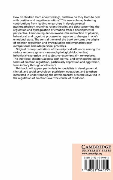 Provides a developmental perspective of the regulation and dysregulation of emotion, in particular, how children learn about feelings and how they learn to deal with both positive and negative feelings. Emotion regulation involves the interaction of physical, behavioral, and cognitive processes in response to changes in one's emotional state. The changes can be brought on by factors internal to the individual (e.g. biological) or external (e.g. other people). Featuring contributions from leading researchers in developmental psychopathology, the volume concentrates on recent theories and data concerning the development of emotion regulation with an emphasis on both intrapersonal and interpersonal processes. Original conceptualizations of the reciprocal influences among the various response systems - neurophysiological-biochemical, behavioral-expressive, and subjective-experiential - are provided, and the individual chapters address both normal and psychopathological forms of emotion regulation, particularly depression and aggression, from infancy through adolescence. This book will appeal to specialists in developmental, clinical, and social psychology, psychiatry, education, and others interested in understanding the developmental processes involved in the regulation of emotion over the course of childhood.