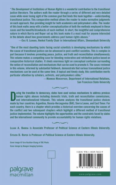 "The Development of Institutions of Human Rights is a wonderful contribution to the transitional justice literature. The authors walk the reader through a series of different and very detailed cases while never losing sight of the common goal that binds this book together - understanding transitional justice. This comparative method allows the reader to make normative judgments on each approach, thus providing insight for both academics and policymakers alike. The reader of this book walks away with a better conceptualization of both the methods employed in these cases and the benefits/drawbacks of each method. In short, the insightful and comprehensive nature in which Barria and Roper set up this text make it a must read for anyone interested in the debate about how governments address past human rights abuses." - Eric K. Leonard, Henkel Family Chair in International Affairs, Shenandoah University