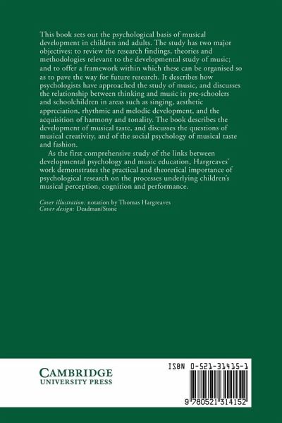 This book sets out the psychological basis of musical development in children and adults. The study has two major objectives: to review the research findings, theories and methodologies relevant to the developmental study of music; and to offer a framework within which these can be organised so as to pave the way for future research. It describes the relationship between thinking and music, and discusses the relationship between thinking and music in pre-schoolers and schoolchildren in areas such as singing, aesthetic appreciation, rhythmic and melodic development, and the acquisition of harmony and tonality. The book describes the development of musical taste, and discusses the questions of musical creativity, and of the social psychology of musical taste and fashion. As the first comprehensive study of the links between developmental psychology and music education, Hargreaves' work demonstrates the practical and theoretical importance of psychological research on the process underlying children's musical perception, cognition and performance.