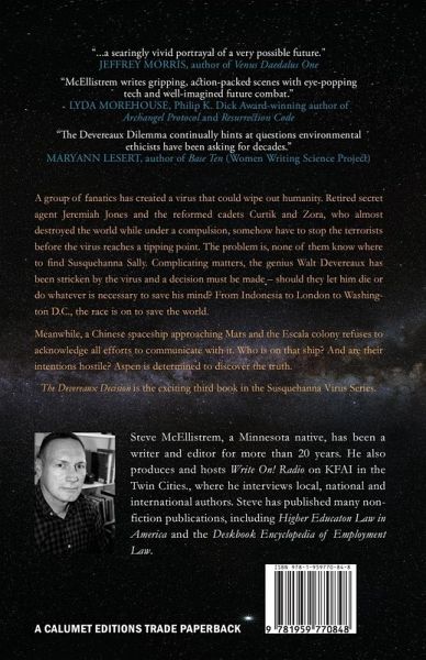 A group of fanatics has created a virus that could wipe out humanity. Zora and Curtik, the bio-engineered cadets who were saved by Jeremiah Jones before they could annihilate Earth, are intent on redeeming themselves by finding and stopping the terrorists. They go to work with an entire CINTEP team - including Ned Jefferson, Lendra Riley and Trogan Brosk - as they attempt to track down Susquehanna Sally. Will they succeed, and will they be in time? Or has the spread of the virus reached a tipping point, creating an unstoppable force? From Indonesia to London to Washington DC, the race is on to save humanity. And there's another problem demanding attention: Walt Devereaux has been stricken by the virus too. Will they be able to save him as well? Eventually, Jeremiah is forced to come out of retirement and join in the efforts to save the world. But he is just a shell of his old self, decimated by the virus, no longer the near-invincible agent he once was. As we finally learn Susquehanna Sally's identity, and what motivated her to become the world's most dangerous terrorist, a Chinese spaceship approaches the Escala colony on Mars and ignores all efforts to contact it. Aspen and her fellow cadets suspect that its inhabitants' intentions are hostile, while the peace-loving Escala don't seem concerned about enacting defensive measures. How far will Aspen go to protect them? The Devereaux Decision was named as a finalist for a Minnesota Book Award, a Midwest Book Award, and an International Book Award in Science Fiction.