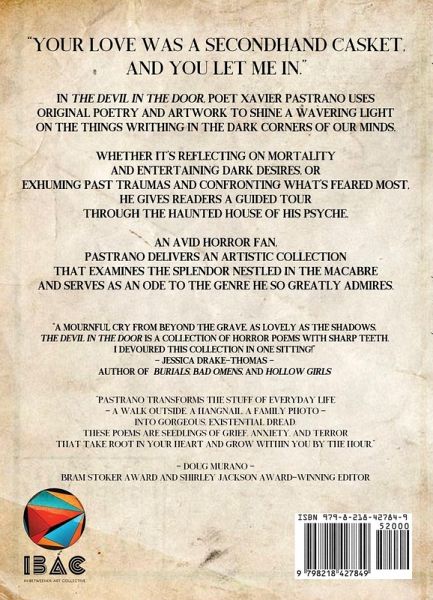 In The Devil in the Door, poet Xavier Pastrano steps away from his more traditional style of writing and sidles into the world of Dark Poetry. Through original poetry and art, Pastrano shines a wavering light on the things writhing in the dark corners of our minds. Whether it's reflecting on mortality and entertaining dark desires, or exhuming past traumas and confronting what's feared most, he gives readers a guided tour through the haunted house of his psyche. An avid Horror fan, Pastrano delivers an artistic collection that examines the splendor nestled in the macabre and serves as an ode to a genre he greatly admires.