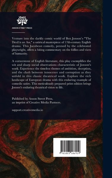 Venture into the darkly comic world of Ben Jonson's "The Devil is an Ass," a satirical masterpiece of 17th-century English drama. This Jacobean comedy, penned by the celebrated playwright, offers a biting commentary on the follies and vices of humanity. A cornerstone of English literature, this play exemplifies the wit and sharp social observations characteristic of Jonson's work. Experience the timeless themes of ambition, deception, and the clash between innocence and corruption as they unfold in this classic theatrical work. Explore the rich landscape of European drama with this enduring example of comedic satire. This meticulously prepared print edition brings Jonson's enduring theatrical vision to life. This work has been selected by scholars as being culturally important, and is part of the knowledge base of civilization as we know it. This work is in the public domain in the United States of America, and possibly other nations. Within the United States, you may freely copy and distribute this work, as no entity (individual or corporate) has a copyright on the body of the work. Scholars believe, and we concur, that this work is important enough to be preserved, reproduced, and made generally available to the public. We appreciate your support of the preservation process, and thank you for being an important part of keeping this knowledge alive and relevant.
