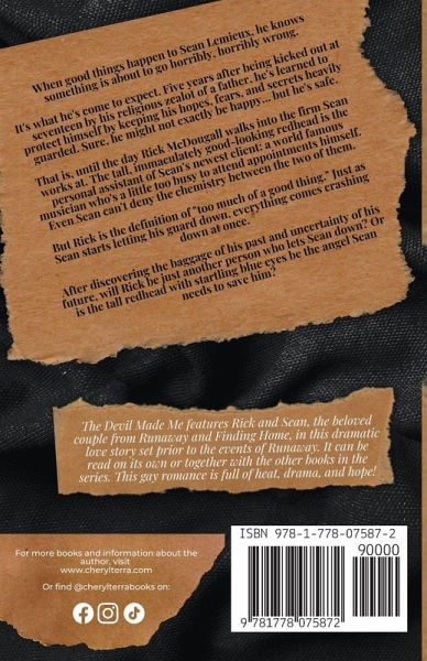 When good things happen to Sean Lemieux, he knows something is about to go horribly, horribly wrong. It's what he's come to expect. Five years after being kicked out at seventeen by his religious zealot of a father, he's learned to protect himself by keeping his hopes, fears, and secrets heavily guarded. Sure, he might not exactly be happy... but he's safe. That is, until the day Rick McDougall walks into the firm Sean works at. The tall, immaculately good-looking redhead is the personal assistant of Sean's newest client: a world famous musician who's a little too busy to attend appointments himself. Even Sean can't deny the chemistry between the two of them. But Rick is the definition of "too much of a good thing." Just as Sean starts letting his guard down, everything comes crashing down at once. After discovering the baggage of his past and uncertainty of his future, will Rick be just another person who lets Sean down? Or is the tall redhead with startling blue eyes be the angel Sean needs to save him? The Devil Made Me is part of the Love Across Canada series, a four-book series of interconnected standalones about three different couples. While the books can be read in any order, The Devil Made Me is best read after Get Over It and Runaway.