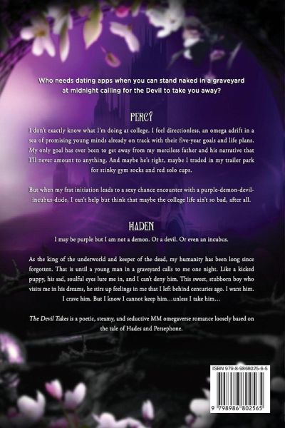 Percy: I don't know what I'm doing at college. I feel directionless, an omega adrift in a sea of promising young minds already on track with their five-year goals and life plans. My only goal has ever been to get away from my merciless father and his narrative that I'll never amount to anything. And maybe he's right, maybe I traded in our trailer park for stinky gym socks and red solo cups. But when my frat initiation leads to a sexy chance encounter with a purple-demon-devil-incubus-dude, I can't help but think that maybe the college life ain't so bad, after all. Haden: I may be purple but I am not a demon. Or a devil. Or even an incubus. As the king of the underworld and keeper of the dead, my humanity has been long since forgotten. That is until a young man in a graveyard calls to me one night. Like a kicked puppy, his sad, soulful eyes lure me in, and I can't deny him. This sweet, docile boy who visits me in his dreams, he stirs up feelings in me that I left behind centuries ago. I want him. I crave him. But I know I cannot keep him...unless I take him... Who needs dating apps when you can stand naked in a graveyard at midnight calling for the Devil to take you away? Follow Haden and Percy on their adventures in both the mortal realm and in the fictional kingdom of Hell. High heat, Omegaverse, with a HEA. The Devil Takes is a poetic, steamy, and seductive MM omegaverse romance loosely based on the tale of Hades and Persephone. It is part one of a duet following Percy, an inexperienced and timid college student, and Haden, the god of the underworld. Book one has a HFN ending and no cliffhanger. For a full list of contents check the author's website or social media at faelovesart.com