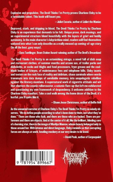 "Explosive and propulsive, The Devil Thinks I'm Pretty proves Charlene Elsby to be a formidable talent. This book will haunt you."-Juliet Escoria, author of Juliet the Maniac ¿"Depraved, stark, and dripping in blood, The Devil Thinks I'm Pretty by Charlene Elsby is an experience that demands to be felt. Unique prose, dark musings, and an experimental structure blend beautifully with the layers of grief and bodily autonomy. In the main character's labyrinthine mind, readers will find themselves seduced into what I can only describe as a really messed up coming-of-age story (in all the best, gory ways)."-Sara Tantlinger, Bram Stoker Award-winning author of The Devil's Dreamland "The Devil Thinks I'm Pretty is an astonishing mirage, a novel full of dish soap and restaurant clothes, of summer months and arcane sex, of trailer parks and dishcloths, or cocks and thighs and food processors, fryer grease and the coal-black bodies of Erinyes, of maintenance fees and telephone bills. Elsby taunts and teeters on the rock face of reality and delirium, chaos carnivals where words transmute into data dumps of unreliable memory, into unapologetic rebellion against the literary mundane. A supernatural work of cigarette attitude and wit that shatters the cosmic rollercoaster, a seismic flare-up that left me exhilarated and questioning my own framework of despondency. A welcome addition to the Charlene Elsby manifest. Take a cool walk among the home décor of the Devil, it's lustful, you'll quite like it."-Shane Jesse Christmass, author of Belfie Hell "Unlike Plato's realm of eternal forms, which he associates with the sun, Charlene Elsby's Devil lurks in the solar eclipse, in the eternal shadows that undergird existence. A bildungsroman unlike any other, The Devil Thinks I'm Pretty had me laughing out loud & deeply disturbed. Through surgically precise prose, Elsby conjures a lean & mighty novel set in a trailer park full of memorable characters, devilish disruptions, & a plot that thickens towards an unforgettable finale. I read it in one sitting."-Logan Berry, author of Run-Off Sugar Crystal Lake "As the unnamed narrator of Charlene Elsby's The Devil Thinks I'm Pretty so wisely observes, "We do define people according to what's been done to them, not what they've done." There are those who fuck, and there are those who are fucked. There are performers and there are objects. And at the center of it all, like the brilliant, blinding core of a burning star, there is the image of Marilyn Monroe, whose beauty belonged only to those around her. With intense and direct language, Elsby reminds us that corrupting forces are always at work, howling mockery at our very desire to be loved."-David Peak, author of Corpsepaint