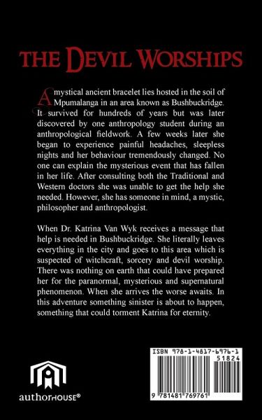 A mystical ancient bracelet lies hosted in the soil of Limpopo in an area known as Bushbuckridge. It survived for hundreds of years but was later discovered by one anthropology student whilst in the midst of an anthropology fieldwork. A few weeks later she begins to experience painful headaches, sleepless night and her behaviour tremendously changes. No one can explain the mysterious event that has fallen in her life. After consulting both the traditional and western doctors she was unable to get the help she needed. However, she has someone in mind, a mystic, philosopher and anthropologist. When Dr. Katrina Van Wyk receives a message that help is needed in Bushbuckridge. She literally leaves everything in the city and goes to this area which is suspected of witchcraft, sorcery and devil worship .There was nothing on earth that could have prepared her for the paranormal, mysterious and supernatural phenomenon. When she arrives the worse awaits. In this adventure something sinister is about to happen, something that could torment Katrina for eternity.