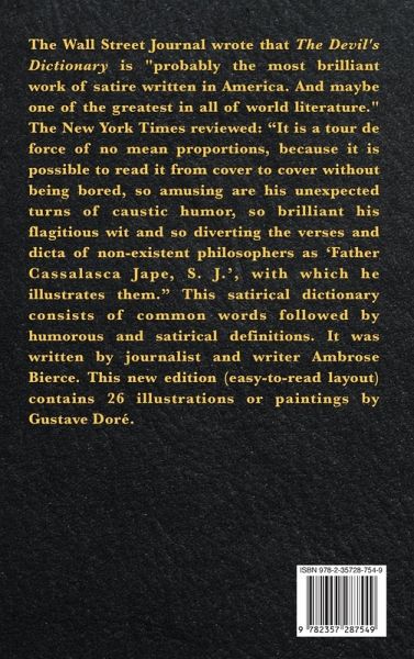 The Wall Street Journal wrote that The Devil's Dictionary is "probably the most brilliant work of satire written in America. And maybe one of the greatest in all of world literature." The New York Times reviewed: "It is a tour de force of no mean proportions, because it is possible to read it from cover to cover without being bored, so amusing are his unexpected turns of caustic humor, so brilliant his flagitious wit and so diverting the verses and dicta of non-existent philosophers as 'Father Cassalasca Jape, S. J.', with which he illustrates them." This satirical dictionary consists of common words followed by humorous and satirical definitions. It was written by journalist and writer Ambrose Bierce. This new edition (easy-to-read layout) contains 26 illustrations or paintings by Gustave Doré. Excerpt: CANNON, n. An instrument employed in the rectification of national boundaries. MARRIAGE, n. The state or condition of a community consisting of a master, a mistress and two slaves, making in all, two. RELIGION, n. A daughter of Hope and Fear, explaining to Ignorance the nature of the Unknowable. RUBBISH, n. Worthless matter, such as the religions, philosophies, literatures, arts and sciences of the tribes infesting the regions lying due south from Boreaplas. YOUTH, n. The Period of Possibility, when Archimedes finds a fulcrum, Cassandra has a following and seven cities compete for the honor of endowing a living Homer.