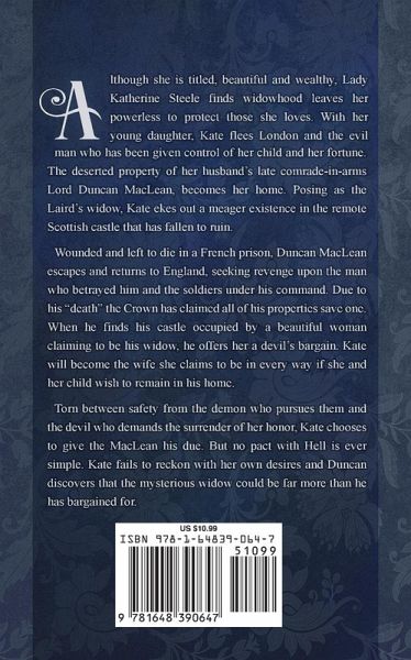 Although she is titled, beautiful and wealthy, Lady Katherine Steele finds widowhood leaves her powerless to protect those she loves. With her young daughter, Kate flees London and the evil man who has been given control of her child and her fortune. The deserted property of her husband's late comrade-in-arms Lord Duncan MacLean, becomes her home. Posing as the Laird's widow, Kate ekes out a meager existence in the remote Scottish castle that has fallen to ruin. Wounded and left to die in a French prison, Duncan MacLean escapes and returns to England, seeking revenge upon the man who betrayed him and the soldiers under his command. Due to his "death" the Crown has claimed all of his properties save one. When he finds his castle occupied by a beautiful woman claiming to be his widow, he offers her a devil's bargain. Kate will become the wife she claims to be in every way if she and her child wish to remain in his home. Torn between safety from the demon who pursues them and the devil who demands the surrender of her honor, Kate chooses to give the MacLean his due. But no pact with Hell is ever simple. Kate fails to reckon with her own desires and Duncan discovers that the mysterious widow could be far more than he has bargained for.
