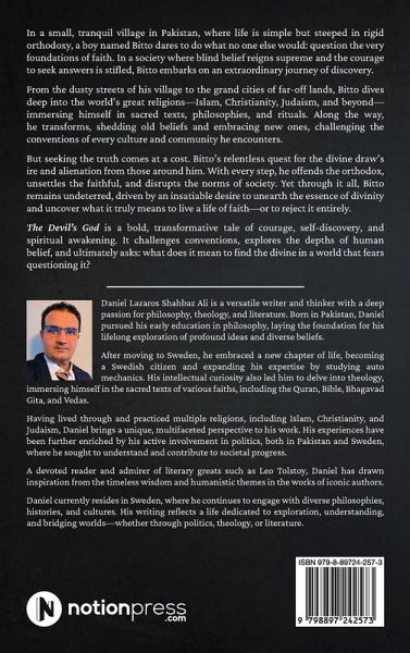 The Devil's God In a small, tranquil village in Pakistan, where life is simple but steeped in rigid orthodoxy, a boy named Bitto dares to do what no one else would: question the very foundations of faith. In a society where blind belief reigns supreme and the courage to seek answers is stifled, Bitto embarks on an extraordinary journey of discovery. From the dusty streets of his village to the grand cities of far-off lands, Bitto dives deep into the world's great religions-Islam, Christianity, Judaism, and beyond-immersing himself in sacred texts, philosophies, and rituals. Along the way, he transforms, shedding old beliefs and embracing new ones, challenging the conventions of every culture and community he encounters. But seeking the truth comes at a cost. Bitto's relentless quest for the divine draw's ire and alienation from those around him. With every step, he offends the orthodox, unsettles the faithful, and disrupts the norms of society. Yet through it all, Bitto remains undeterred, driven by an insatiable desire to unearth the essence of divinity and uncover what it truly means to live a life of faith-or to reject it entirely. The Devil's God is a bold, transformative tale of courage, self-discovery, and spiritual awakening. It challenges conventions, explores the depths of human belief, and ultimately asks: what does it mean to find the divine in a world that fears questioning it?