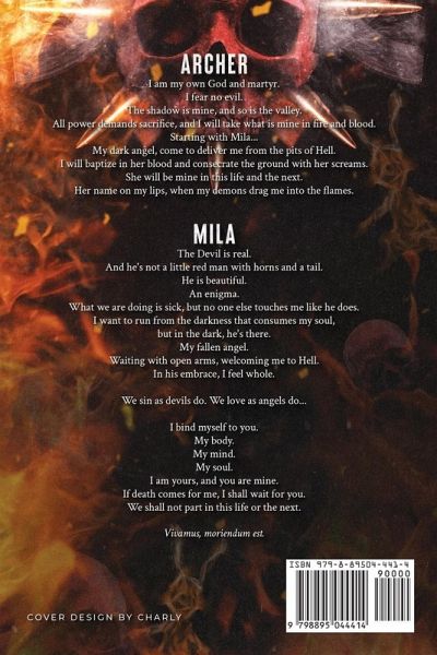 Archer I am my own God and martyr. I fear no evil. The shadow is mine, and so is the valley. All power demands sacrifice, and I will take what is mine in fire and blood. Starting with Mila... My dark angel, come to deliver me from the pits of Hell. I will baptize in her blood and consecrate the ground with her screams. She will be mine in this life and the next. Her name on my lips, when my demons drag me into the flames. Mila The Devil is real. And he's not a little red man with horns and a tail. He is beautiful. An enigma. What we are doing is sick, but no one else touches me like he does. I want to run from the darkness that consumes my soul, but in the dark, he is there. My fallen angel. Waiting with open arms, welcoming me to Hell. In his embrace, I feel whole. We sin as devils do. We love as angels do... I bind myself to you. My body. My mind. My soul. I am yours, and you are mine. If death comes for me, I shall wait for you. We shall not part in this life or the next. Vivamus, moriendum est.