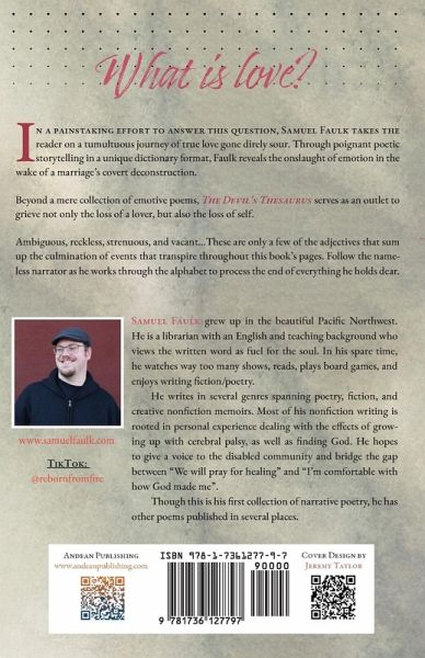 What is love? In a painstaking effort to answer this question, Samuel Faulk takes the reader on a tumultuous journey of true love gone direly sour. Through poignant poetic storytelling in a unique dictionary format, Faulk reveals the onslaught of emotion in the wake of a marriage's covert deconstruction. Beyond a mere collection of emotive poems, The Devil's Thesaurus serves as an outlet to grieve not only the loss of a lover, but also the loss of self. Ambiguous, reckless, strenuous, and vacant...These are only a few of the adjectives that sum up the culmination of events that transpire throughout this book's pages. Follow the nameless narrator as he works through the alphabet to process the end of everything he holds dear.