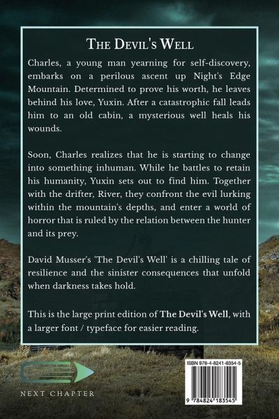 Charles, a young man yearning for self-discovery, embarks on a perilous ascent up Night's Edge Mountain. Determined to prove his worth, he leaves behind his love, Yuxin. After a catastrophic fall leads him to an old cabin, a mysterious well heals his wounds. Soon, Charles realizes that he is starting to change into something inhuman. While he battles to retain his humanity, Yuxin sets out to find him. Together with the drifter, River, they confront the evil lurking within the mountain's depths, and enter a world of horror that is ruled by the relation between the hunter and its prey. David Musser's 'The Devil's Well' is a chilling tale of resilience and the sinister consequences that unfold when darkness takes hold. This is the large print edition of The Devil's Well, with a larger font / typeface for easier reading.