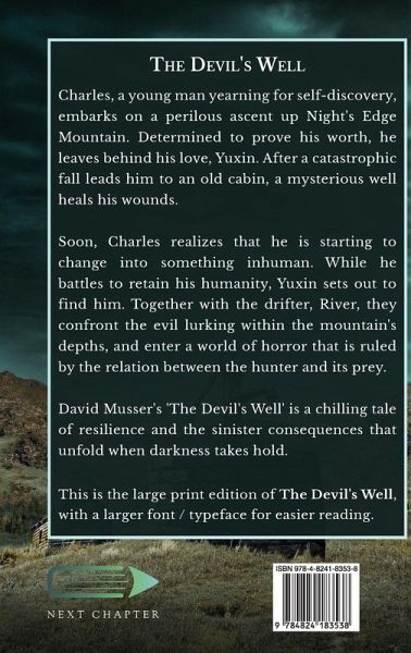 Charles, a young man yearning for self-discovery, embarks on a perilous ascent up Night's Edge Mountain. Determined to prove his worth, he leaves behind his love, Yuxin. After a catastrophic fall leads him to an old cabin, a mysterious well heals his wounds. Soon, Charles realizes that he is starting to change into something inhuman. While he battles to retain his humanity, Yuxin sets out to find him. Together with the drifter, River, they confront the evil lurking within the mountain's depths, and enter a world of horror that is ruled by the relation between the hunter and its prey. David Musser's 'The Devil's Well' is a chilling tale of resilience and the sinister consequences that unfold when darkness takes hold. This is the large print edition of The Devil's Well, with a larger font / typeface for easier reading.