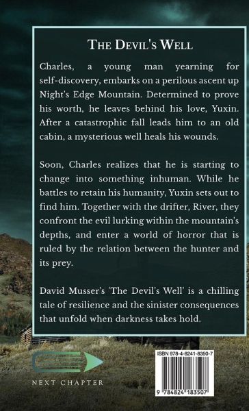 Charles, a young man yearning for self-discovery, embarks on a perilous ascent up Night's Edge Mountain. Determined to prove his worth, he leaves behind his love, Yuxin. After a catastrophic fall leads him to an old cabin, a mysterious well heals his wounds. Soon, Charles realizes that he is starting to change into something inhuman. While he battles to retain his humanity, Yuxin sets out to find him. Together with the drifter, River, they confront the evil lurking within the mountain's depths, and enter a world of horror that is ruled by the relation between the hunter and its prey. David Musser's 'The Devil's Well' is a chilling tale of resilience and the sinister consequences that unfold when darkness takes hold.