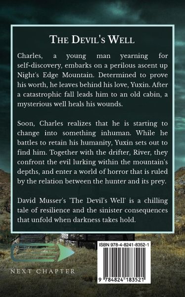 Charles, a young man yearning for self-discovery, embarks on a perilous ascent up Night's Edge Mountain. Determined to prove his worth, he leaves behind his love, Yuxin. After a catastrophic fall leads him to an old cabin, a mysterious well heals his wounds. Soon, Charles realizes that he is starting to change into something inhuman. While he battles to retain his humanity, Yuxin sets out to find him. Together with the drifter, River, they confront the evil lurking within the mountain's depths, and enter a world of horror that is ruled by the relation between the hunter and its prey. David Musser's 'The Devil's Well' is a chilling tale of resilience and the sinister consequences that unfold when darkness takes hold.