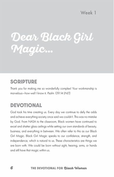 Get ready to put aside obstacles, doubt, fear, and negative self-talk-and say "Hello!" to what makes you truly magical in God's eyes. The Devotional for Black Women offers 52 weeks of biblical devotionals and inspiration rooted in prayer journaling, biblical affirmations, and practical guidance for building intimacy with God. This Christian devotional for women will help you fully embrace your identity in Christ, understand your God-given purpose, and confidently walk in your calling. With weekly devotional content, journaling prompts, and real encouragement, readers will be empowered to: * Overcome societal narratives that too often define Black women's identity * Cultivate a deeper, more personal relationship with God * Build faith, trust, and confidence to walk as a Black Christian woman * And so much more This undated devotional offers the flexibility to engage at your own pace and is the perfect gift for those seeking daily devotional books for women who want to integrate their faith into every part of life.