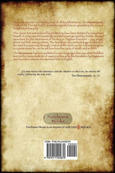 The most popular and widely read of all Buddhist texts, the Dhammapada, (Path of the Eternal Truth), is widely regarded as encapsulating the core of Buddhist philosophy. This classic text was believed by tradition to have been dictated by Sakyamuni himself. It comprises 423 poetically inciteful verses grouped by themes deemed important for the attainment of Nirv¿na or "highest freedom" – joy, anger, desire and hell, among others. The Buddha’s key methodology is control of the mind because only through control of the mind can the follower progress to a point where he can be set free from the cycle of death and re-birth. The Dhammapada has been published in more languages than any other Buddhist text and for many students of eastern philosophy this translation by Wagiswara and Saunders remains the standard text in English.
